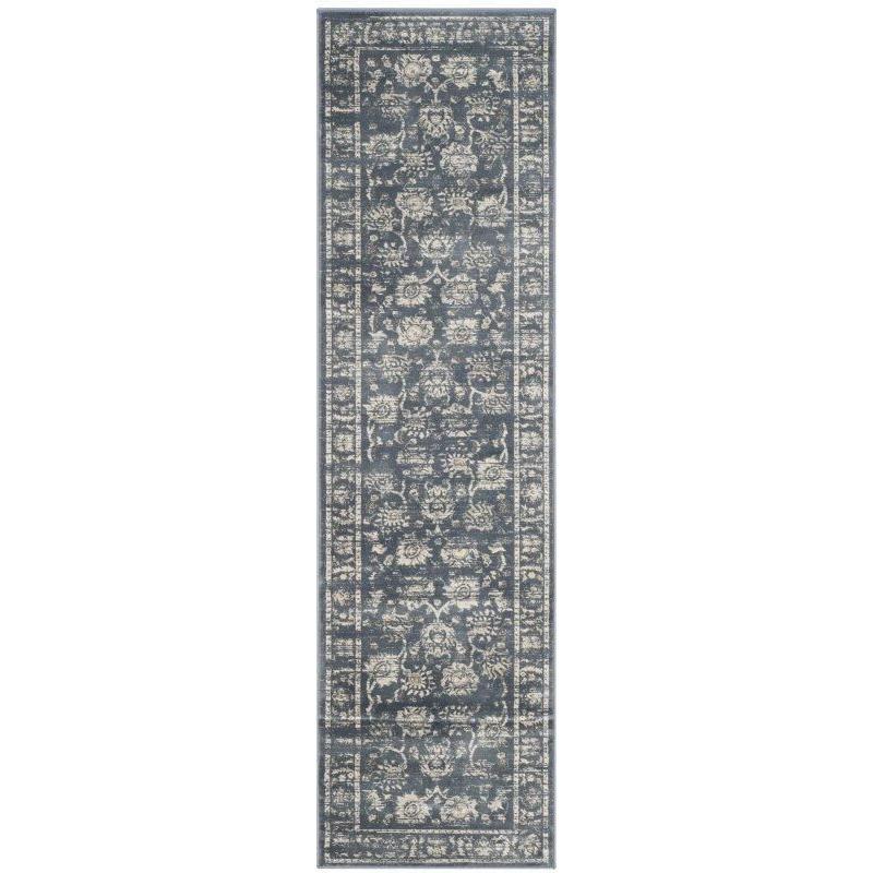 Vintage VTG438G Dark Grey Cream rug from Safavieh's Vintage Collection. This rug embodies the charm of recycling old carpets by over-dyeing them in vibrant colors to conceal imperfections, giving them a new lease of life. Crafted in Belgium, each rug is power loomed using 100% organic viscose yarn with a low cut pile, replicating the vintage worn carpet look flawlessly.