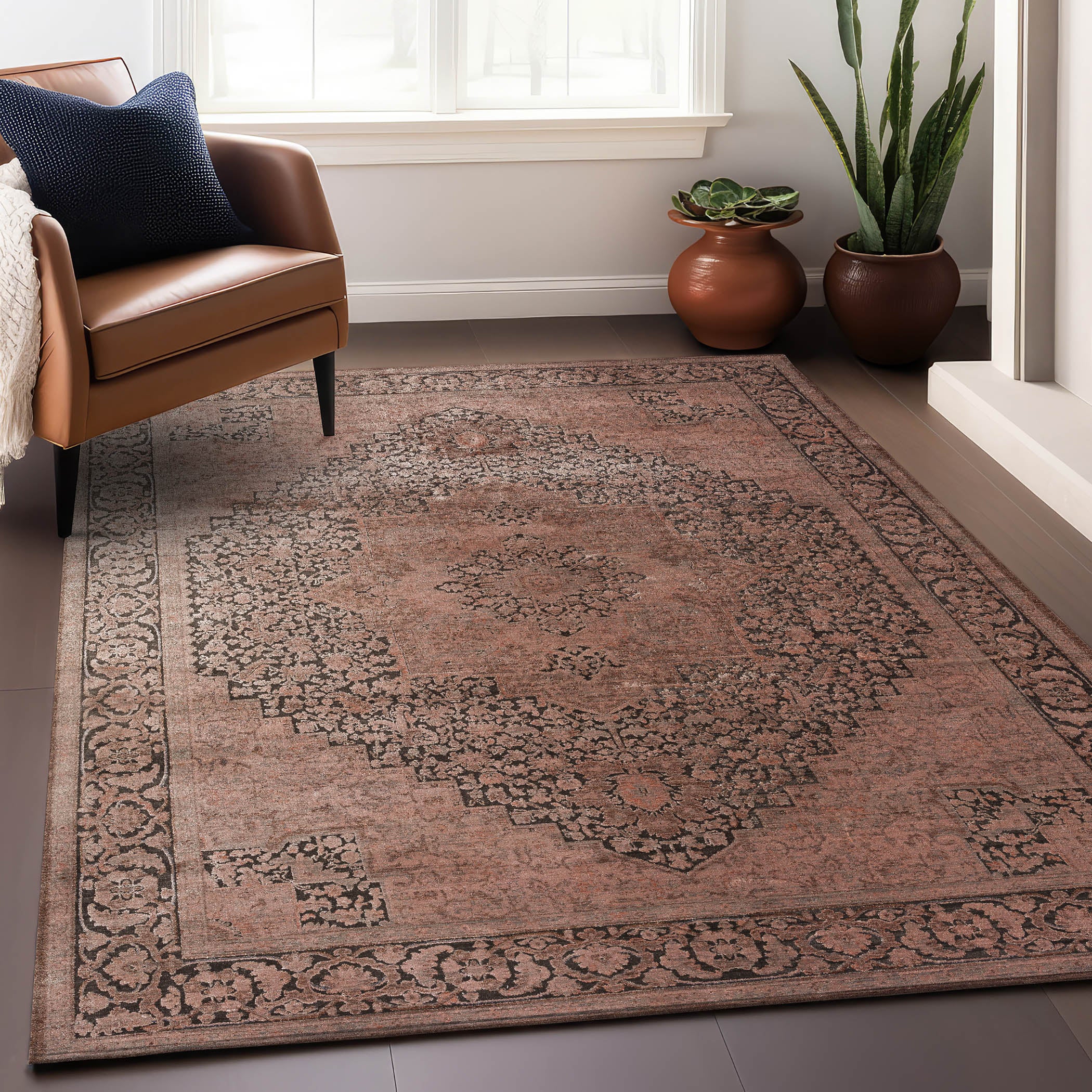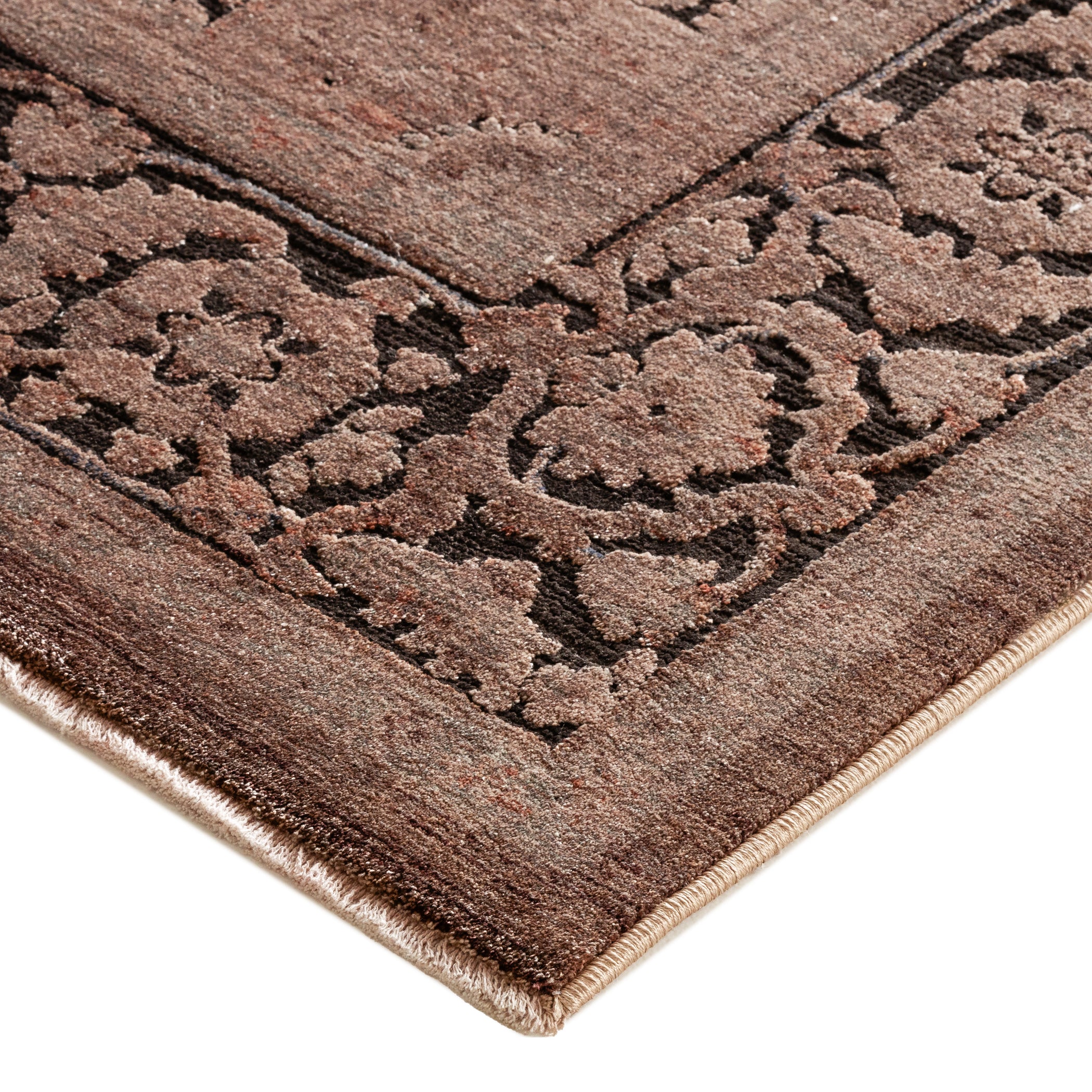 Vizcia VZ3 Brown from our exquisite collection - a blend of old-world charm and modern elegance. Crafted with precision and care, these rugs boast intricate designs and a luxurious feel. The overdyeing process infuses each piece with warmth, creating a cozy ambiance in any space. Made from 100% polyester pile, these rugs are not only soft but also durable for long-lasting use. A subtle cotton fringe adds to their vintage allure, enhancing their authenticity. Designed in Egypt using power-loomed techniques, these rugs pay homage to classical artisanship while embracing a contemporary aesthetic.