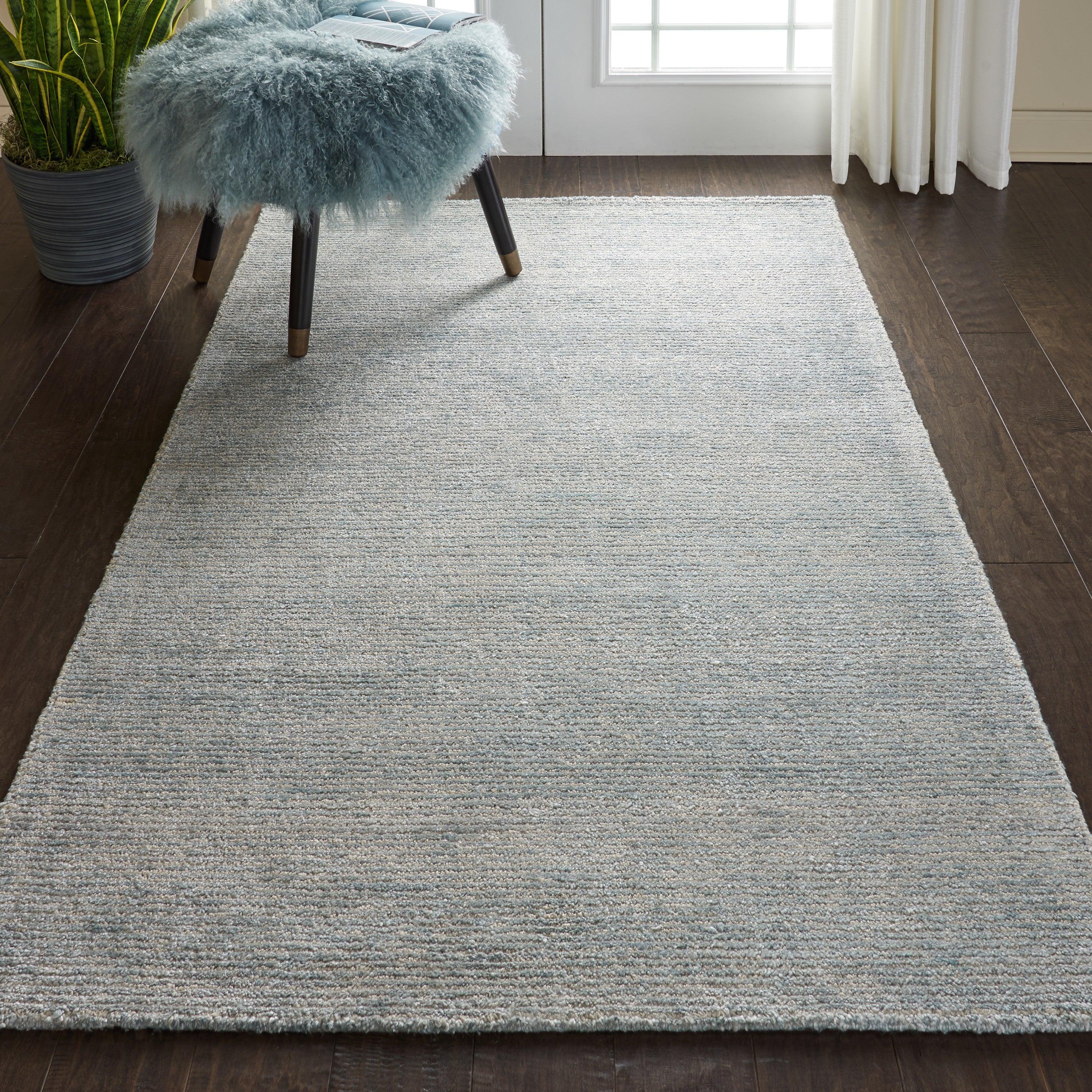 stunning Weston WES01 Aquamarine area rug from the luxurious Weston Collection. This modern rug offers a delightful blend of comfort and functionality, boasting a thick and soft texture that exudes luxury. Hand-woven with a combination of jute and bamboo-extruded silk-like fiber, this rug is not only visually appealing but also durable for long-lasting use.